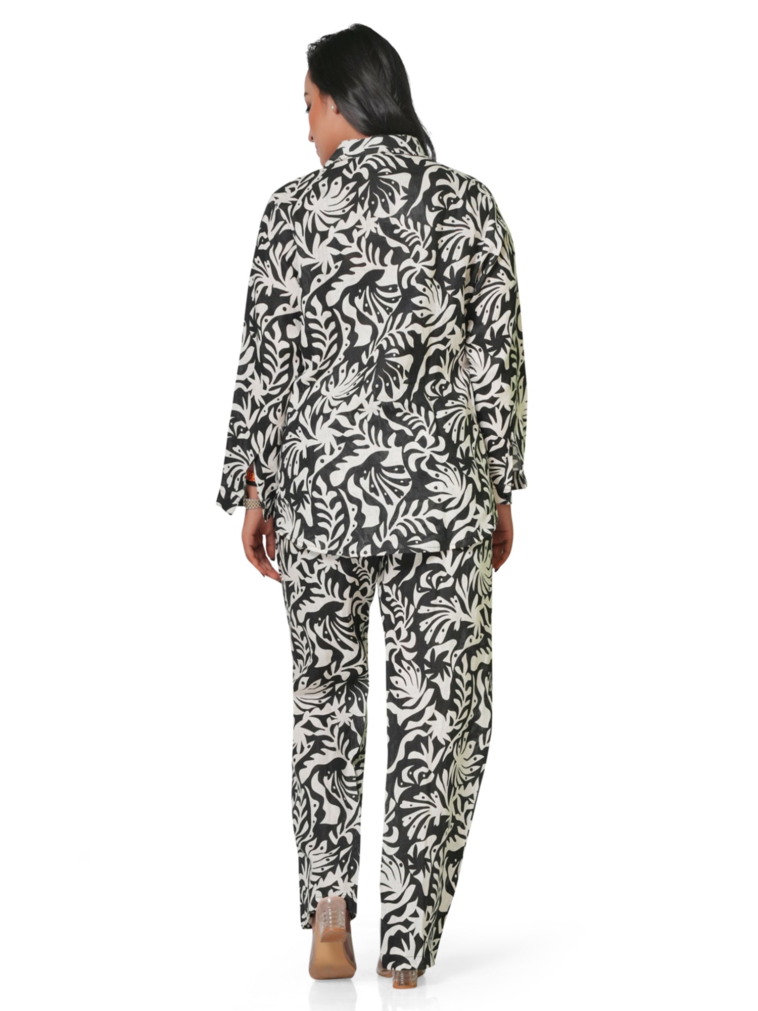 Women's Black & White Leaf Print Linen Co-ord Set – Shirt & Straight Pant
